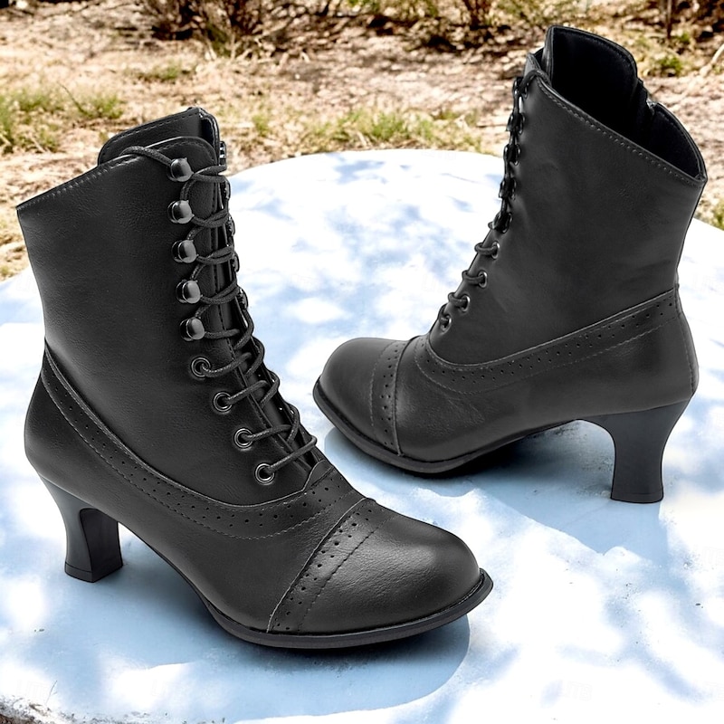 Women's Victorian Brown Lace-Up Mid-Heel Boots with Zipper